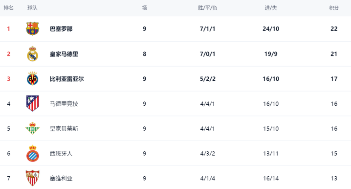 在积分榜,巴萨以22分暂时登上了榜首位置。21分的皇马掉到第2名。不外,皇马比巴萨少踢1场。唯有接下来的比赛皇马得手,就粗略重夺榜首。比利亚雷亚尔以17分排行第3。赢球的马竞总积分达到16分排行第4。皇家贝蒂斯亦然16分,排行第5。