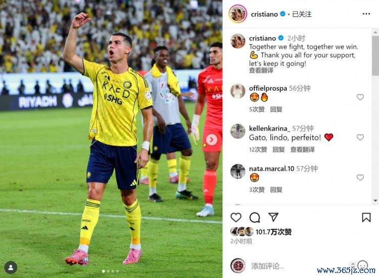 C罗社媒晒出赛后谢场的相片,配文:“咱们一齐宣战,一齐赢!感谢民众的相沿,让咱们陆续赢下去!”