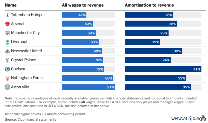 上图中,惟有热刺在2023-24赛季的工资和摊销本钱占收入的比例低于70%,这意味着其余八家俱乐部当年可能皆会达到上限。