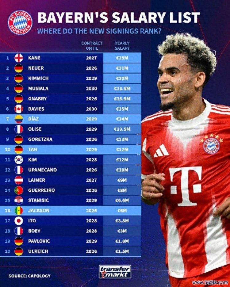 直播吧9月20日讯 德国转会市集列出了拜仁球员的年薪榜单,凯恩2500万欧居首,诺伊尔2100万欧次席,杰克逊600万欧。