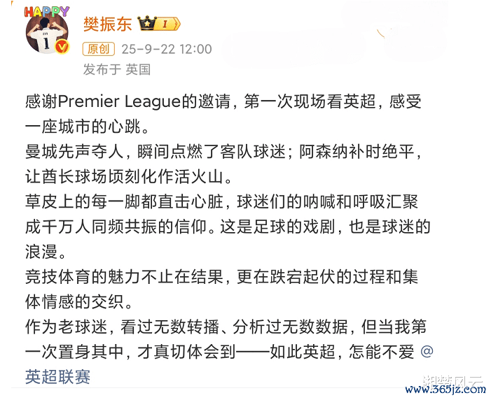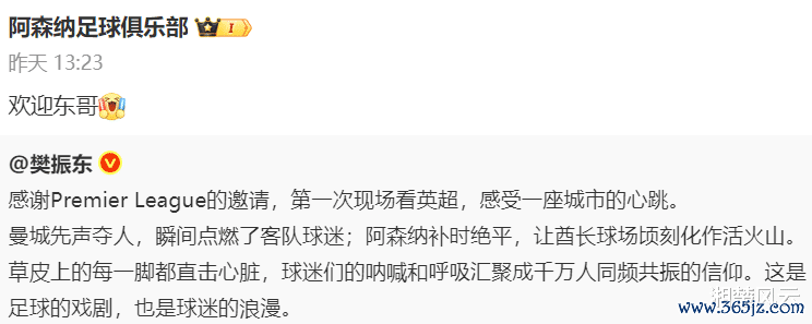 近日,奥运冠军樊振东在社媒发文,感谢了英超联赛。他受英超联赛的邀请,在酋长球场看了一场阿森纳与曼城的比赛。