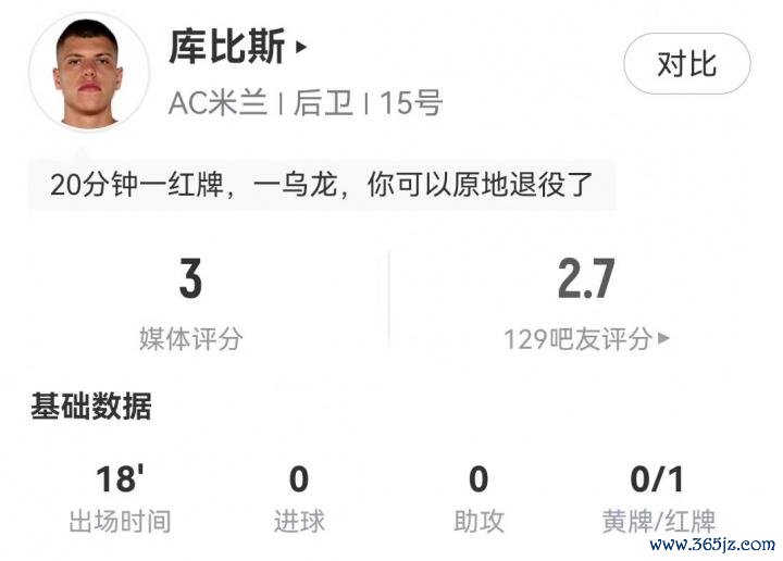 上半场,米兰首发的21岁中卫先是在定位球防备中失慎乌龙,随后又当作临了别称球员拉倒若昂-佩德罗,被出示直红罚出场外,使球队被动堕入十东谈主作战的情况。此外,球队第2个丢球中他也犯了盯东谈主不紧的失实。
