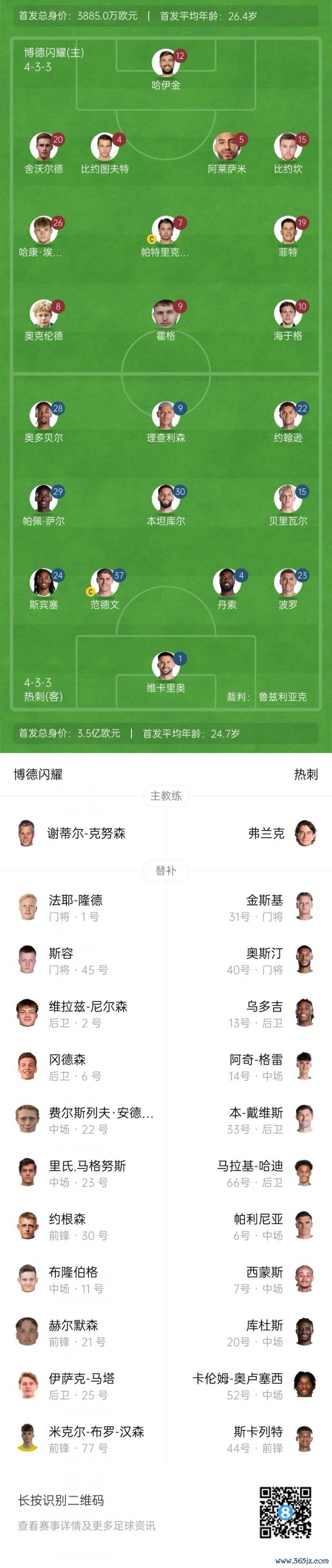 博德精通首发:12-哈伊金、20-舍沃尔德、4-比约夫图特、5-阿莱萨米、15-比约坎、26-哈康·埃文森、7-帕利特克-伯格、19-菲特、8-奥克伦德、9-霍格、10-海于格