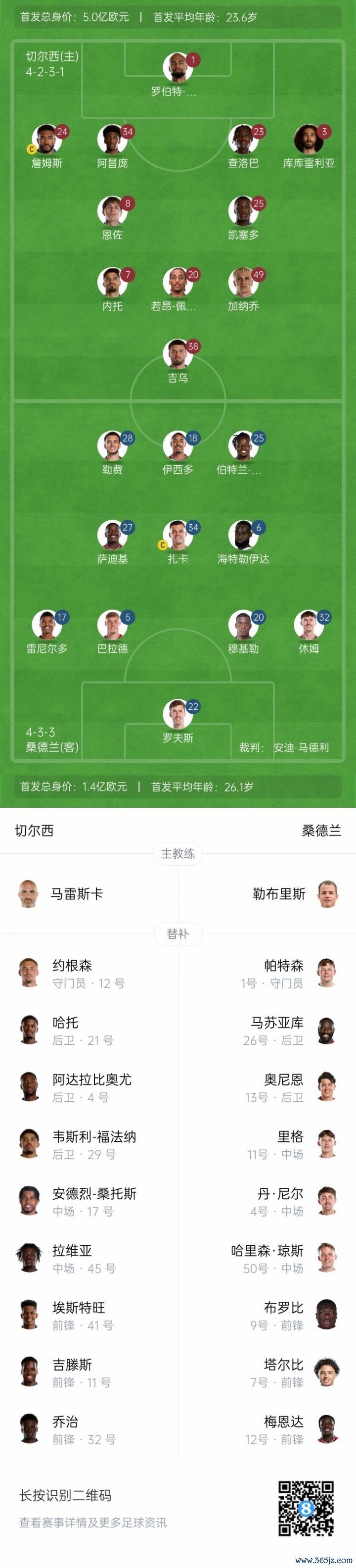 切尔西首发:1-桑切斯、24-詹姆斯、34-乔什·阿昌庞、23-查洛巴、3-库库雷利亚、25-凯塞多、8-恩佐、7-内托、20-若昂·佩德罗、49-加纳乔、38-吉乌
