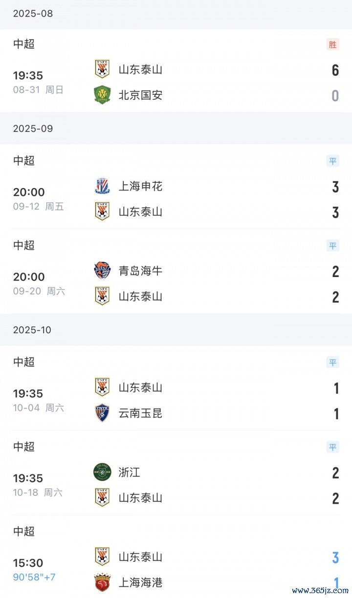 自8月31日6-0大捷国安后,泰山连平申花、海牛、玉昆和浙江。