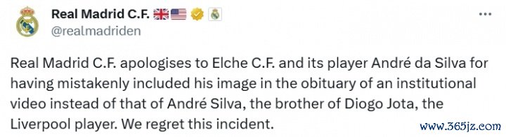 皇家马德里足球俱乐部就机构缅念念视频中误将埃尔切足球俱乐部球员安德烈·达·席尔瓦的画面纳入(该画面本应为利物浦球员迪奥戈·若塔的昆仲安德烈·席尔瓦),向埃尔切俱乐部及安德烈·达·席尔瓦本东说念主致歉。咱们对此事深表歉意。