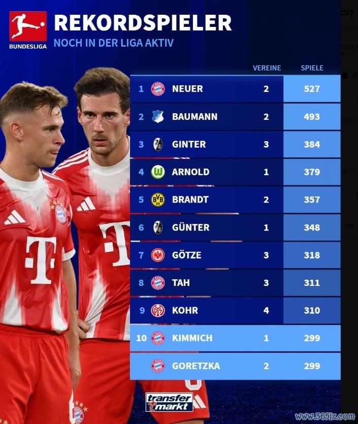 9月26日讯 德国转会市集盘货了德甲现役球员联赛出场数,诺伊尔以527场居首,基米希、格雷茨卡均299场闯进前10,行将迎来300场里程碑。