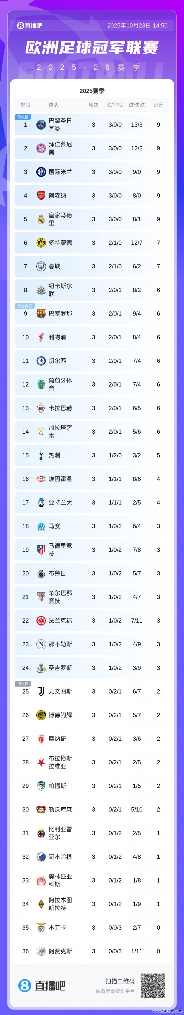 而积分最低的则是本菲卡和阿贾克斯,两队三战都墨,积0分暂列垫底。