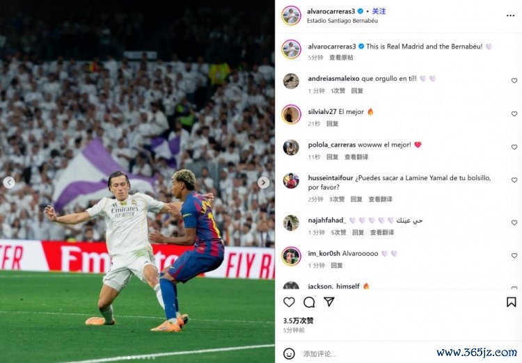 他也在赛后通过社媒晒出同亚马尔的对位照,并配文:“这即是皇家马德里和伯纳乌球场!”