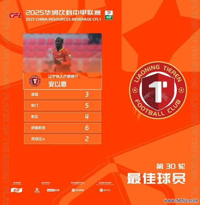11月12日讯 演出帽子戏法的辽宁铁东谈主球员安以恩,当选为中甲联赛第30轮最好球员。