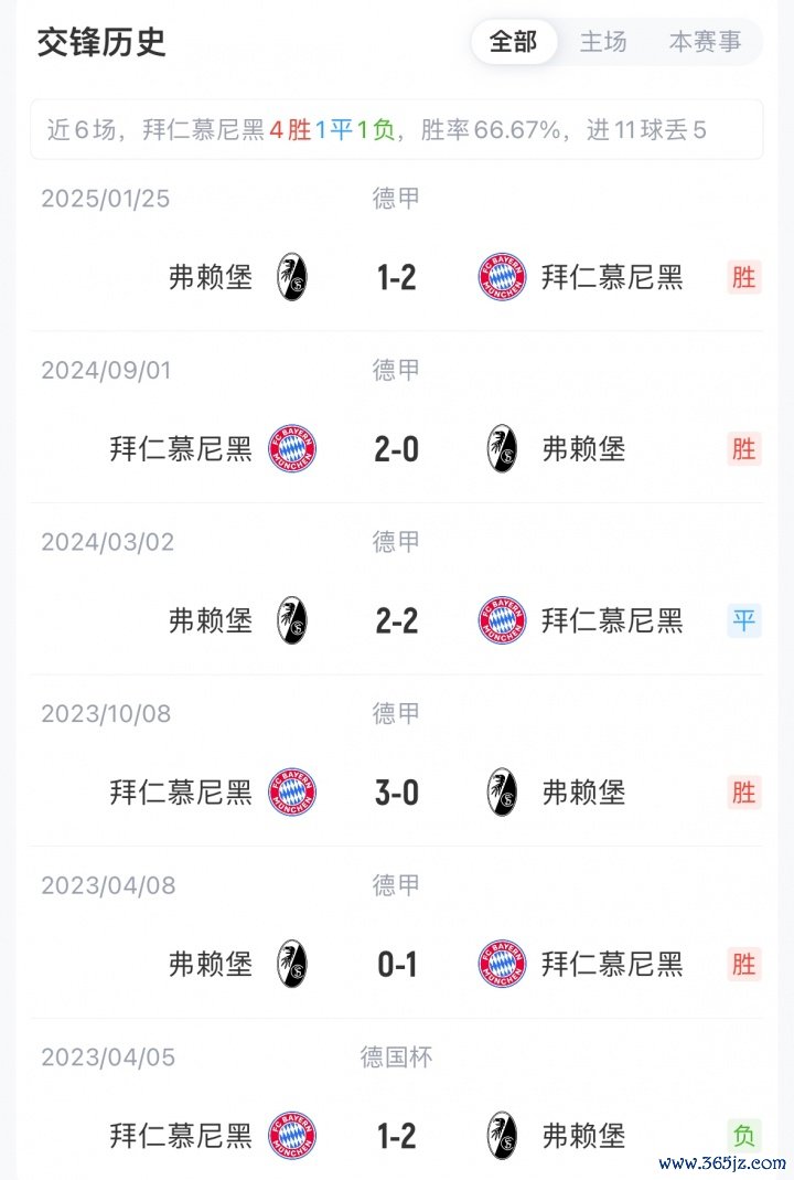 现在,拜仁9胜1平积28分领跑德甲;弗赖堡3胜4平3负积13分位列德甲第10。两边近6次交手,拜仁4胜1平1负占据上风。