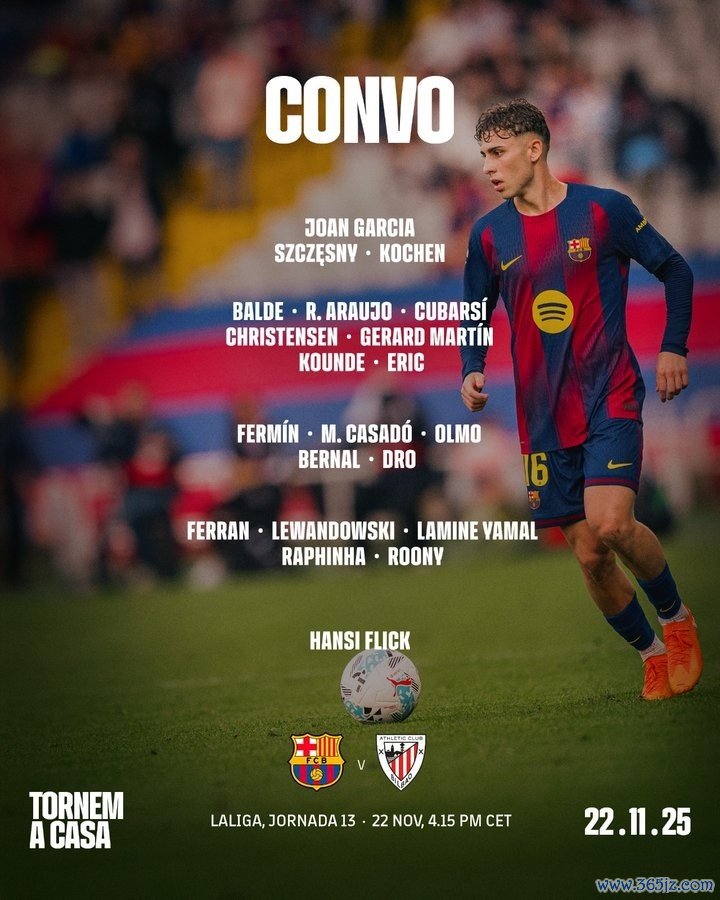 11月22日讯 今晚11点15分,巴萨将在西甲第13轮主场迎战毕尔巴鄂竞技,球队目下公布了比赛名单。