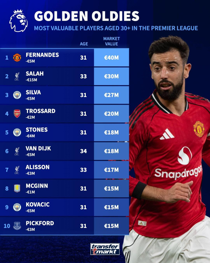 虎扑12月10日讯德转更新了英超球员最新身价,并清点联赛中30岁以上球员身价榜。