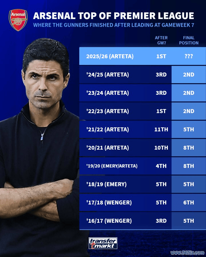虎扑10月05日讯2025/26赛季英超第7轮战罢后,阿森纳在主帅阿尔特塔的指示下暂居积分榜首位。这也曾是枪手近几个赛季屡次在赛季初登顶,但最终能否守住榜首依然充满悬念。