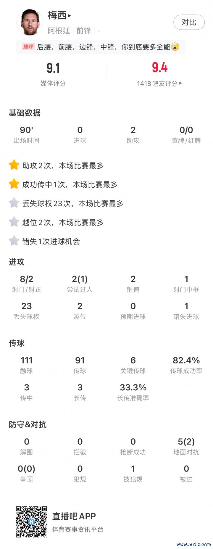 评分9.1分,8次射门2次射正1次中框,2次过东谈主1次告捷,23次丢失球权。