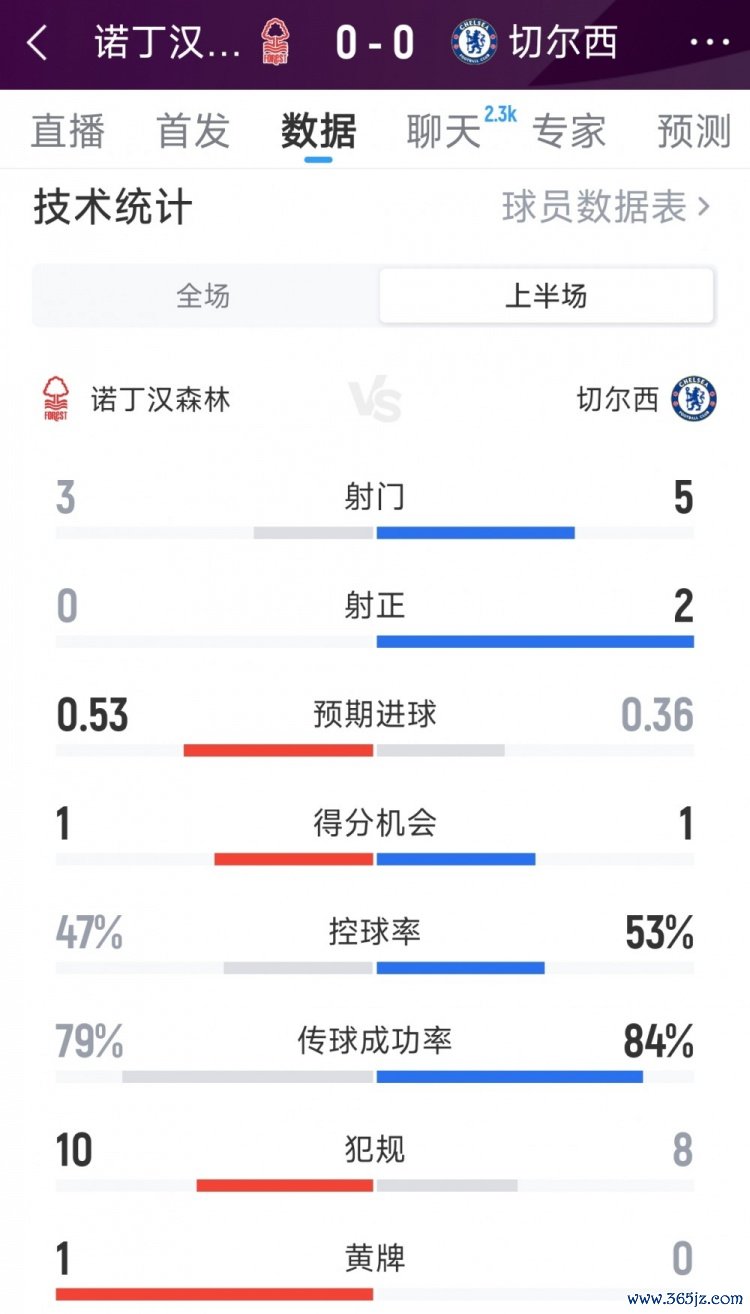 10月18日讯 本轮英超切尔西对阵诺丁汉丛林半场战罢,两边暂时互交白卷,以下为两边半场数据对比:
