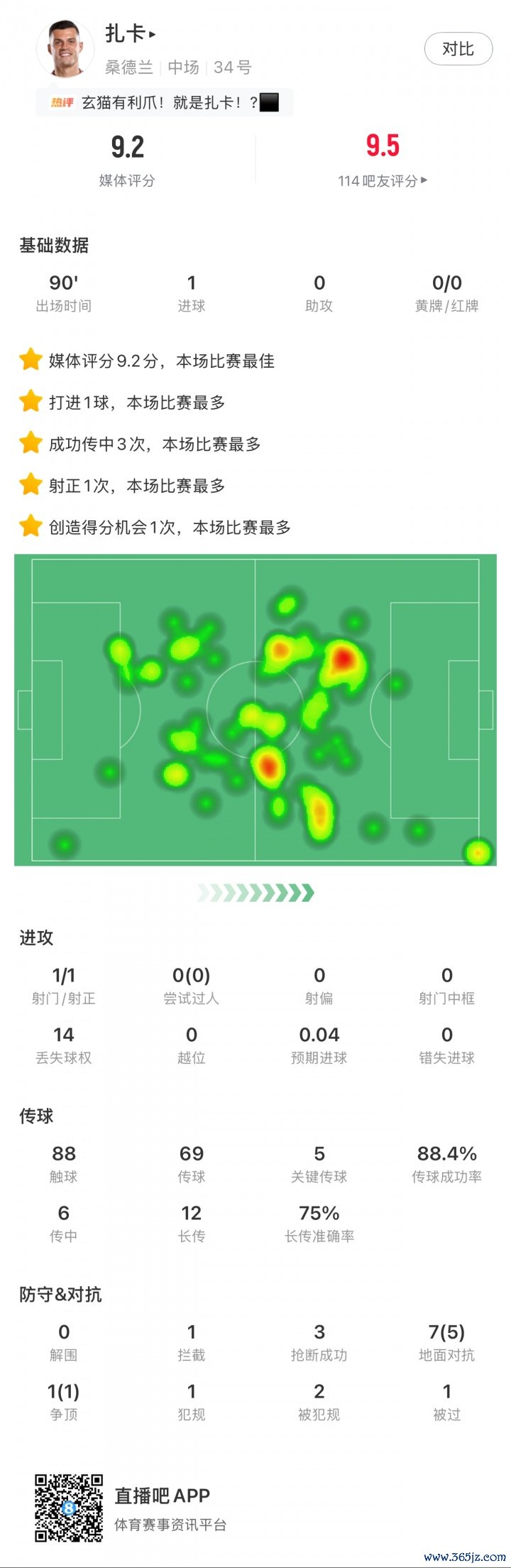 本场比赛,33岁扎卡打满全场,下半场为黑猫打进扳平球,这亦然他的桑德兰糊口首球。他全场88次触球,5次要道传球,6次传中3次顺利,12次长传9次顺利,1次禁绝、3次顺利抢断、7次大地起义5次顺利、1次争顶顺利,获取9.2分全场最高。