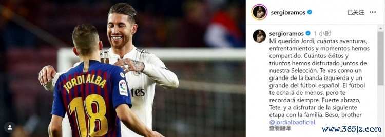10月8日讯 西班牙边卫阿尔巴将在本赛季终结后退役,拉莫斯社媒发文致意。
