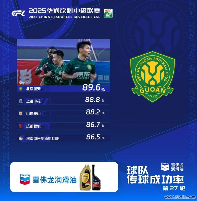10月22日讯 中超联赛官方公布了第27轮传球得胜率名次榜,国安排名第一,申花、泰山分列二、三位。