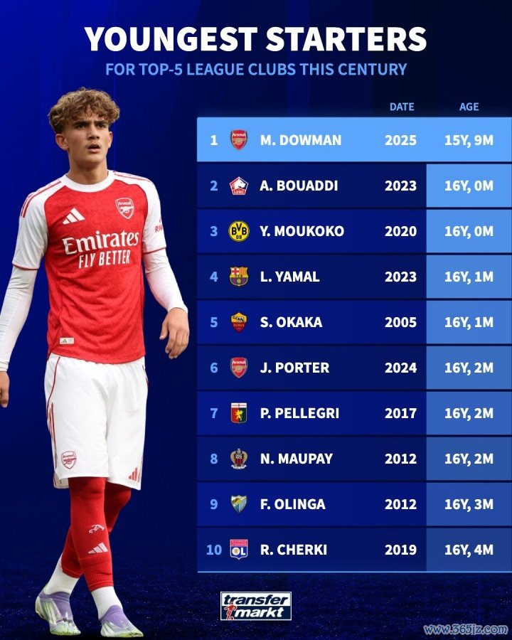 1-谈曼(阿森纳)2025年,15岁零9个月