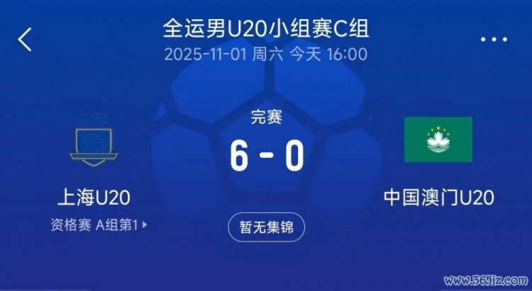 11月1日讯 全运男U20小组赛C组,U20上海6-0打败中国澳门U20。