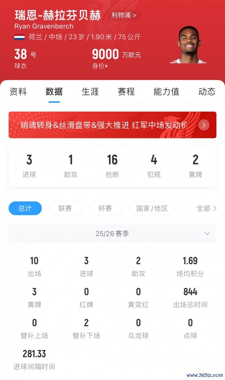 23岁的赫拉芬贝赫2023年以4000万欧转会费从拜仁加盟。本赛季赫拉芬贝赫已为利物浦出场10次,孝顺3球2助。