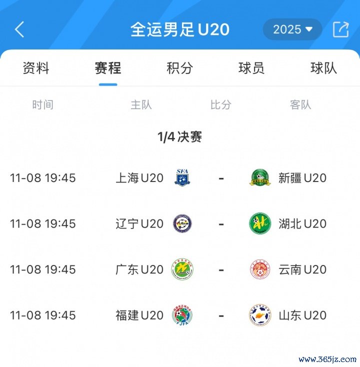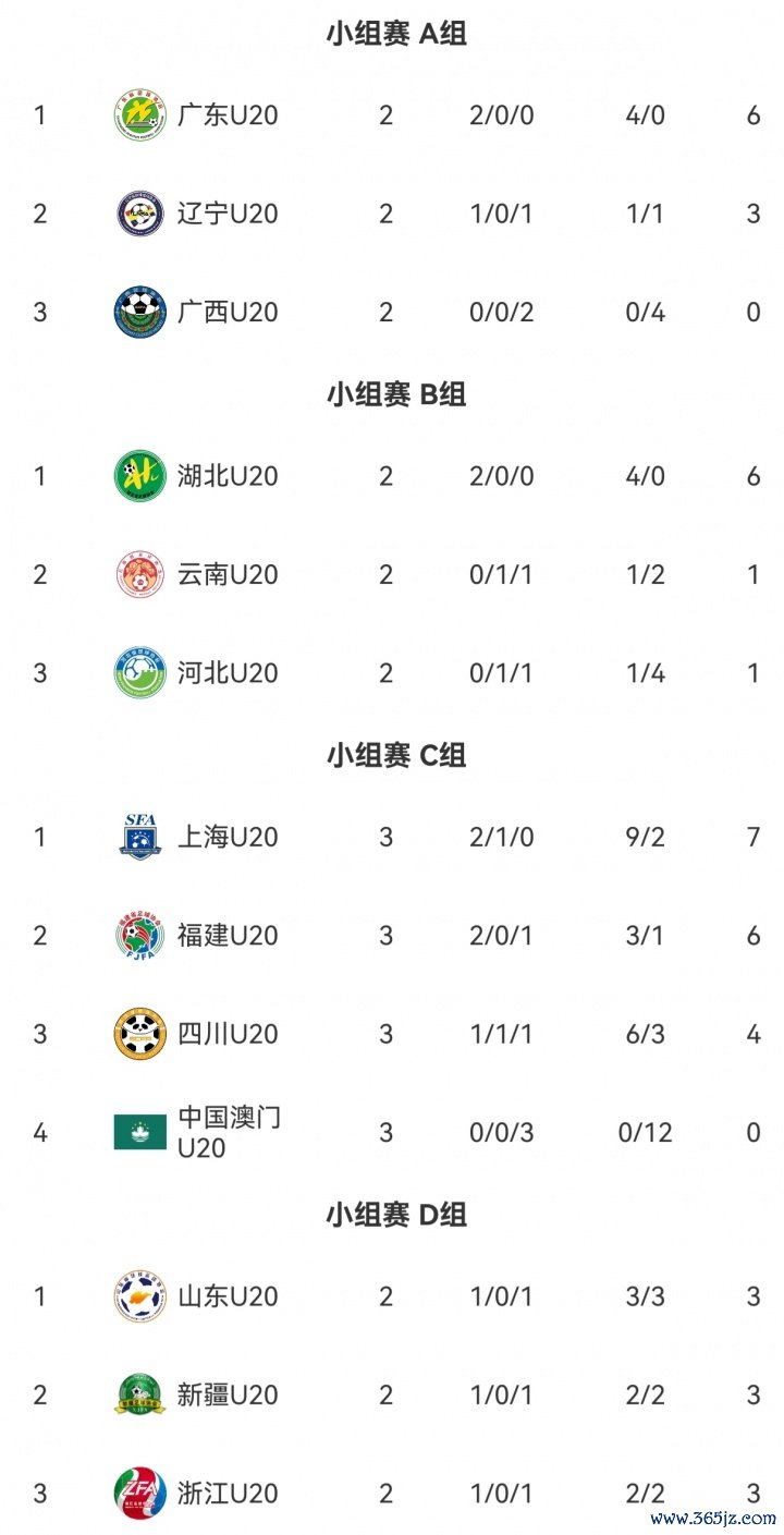 11月6日讯 全运U20男足8强出炉,广东、辽宁从A组出线,湖北、云南从B组出线,上海、福建从C组出线,山东从D组出线。新疆U20抽签晋级,浙江没能晋级将参预排位赛。