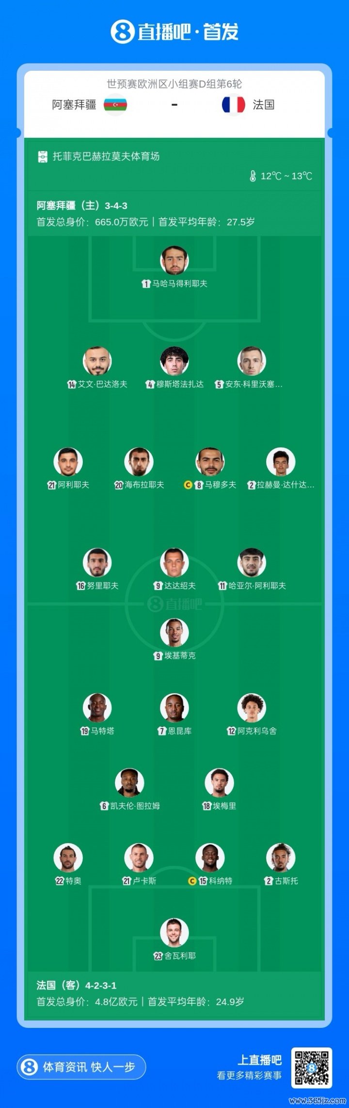 11月16日讯 世初赛欧洲区小组赛D组第6轮,法国客战阿塞拜疆,赛前两边首发公布。姆巴佩因伤提前退出洋家队。